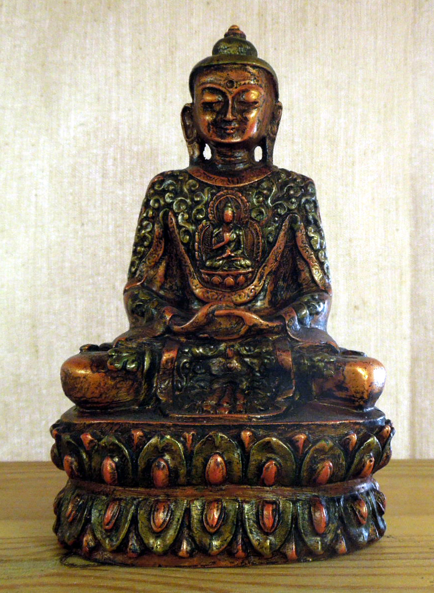 Buddha s gestem meditace - soška z pryskyřice, lakovaná a patinovaná barvami imitujícími kov. Výška 14,5 cm. Země původu: Nepál