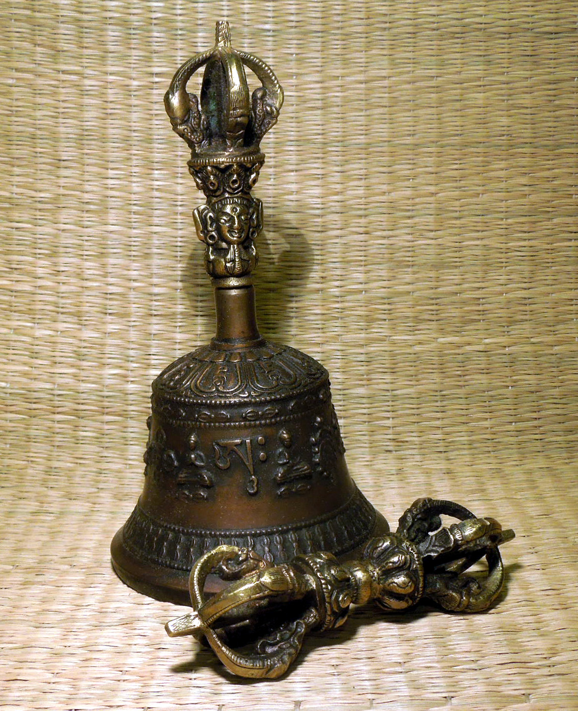Tibetský zvonek dilbu a dordže. Zvonek dilbu je vyroben z bronzu, s mosaznou rukojetí. Výška 18cm, spodní průměr 9,5cm. Dordže je z mosazi, dlouhé 12cm. Země původu: Nepál