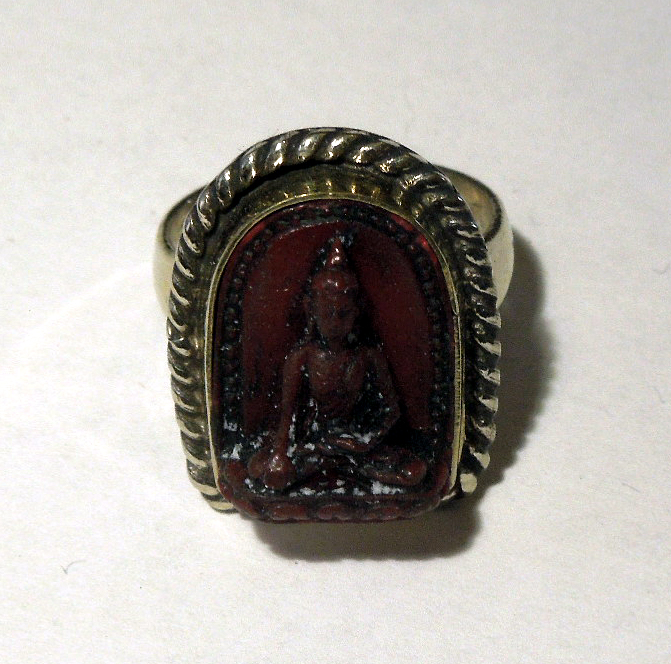 Prsten z bílého kovu s vsazenou plastikou Buddhy z barvené pryskyřice. Vnitřní průměr prstenu je 16 mm. Země původu: Nepál